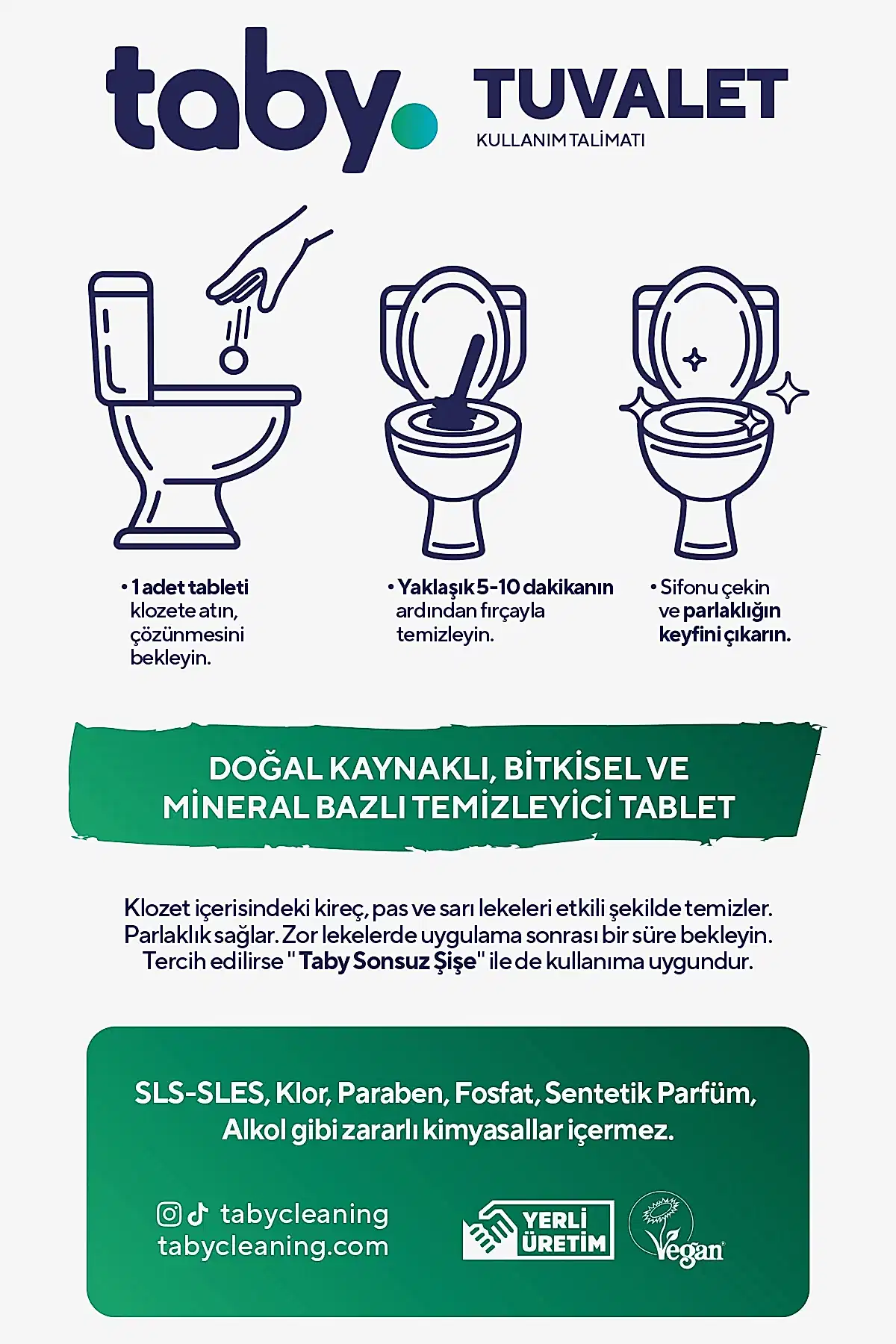 Tuvalet temizliğinde çamaşır suyu kullanımına artık son! Taby’nin Doğal Kaynaklı, Bitkisel ve Mineral Bazlı Tuvalet Temizleyici Tableti ile 5 dakikada kusursuz temizlik çok kolay!